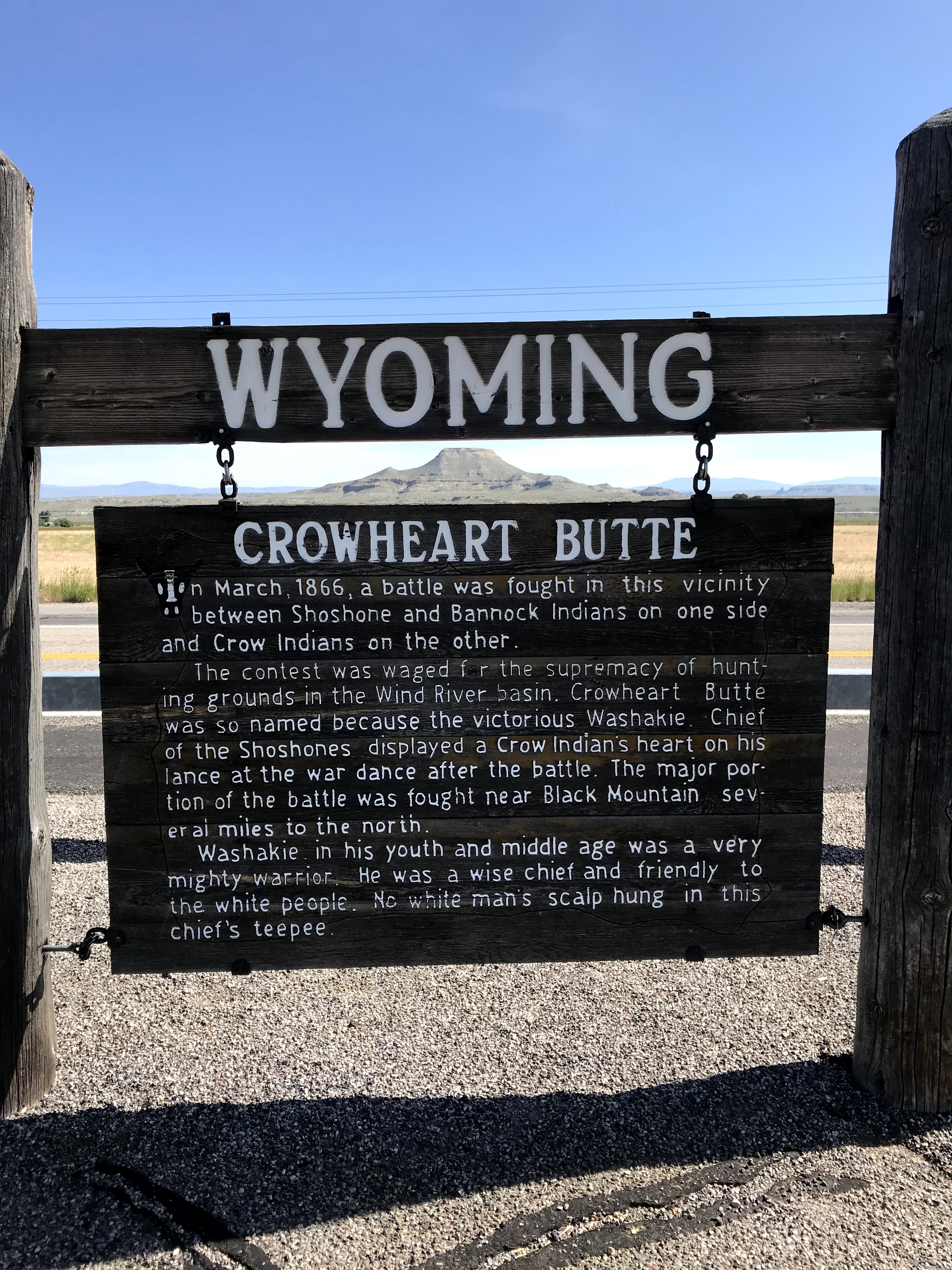 Feeling inquisitive, I stopped at a point of interest on the roadside. I should stop at these more often, since they are usually enlightening and thought provoking – like exercise for the mind while the body cranks those pedals. The hand-carved description told of a legendary battle between Shoshone, Bannock, and Crow Indians for supremacy of hunting grounds in this river basin and surrounding buttes.