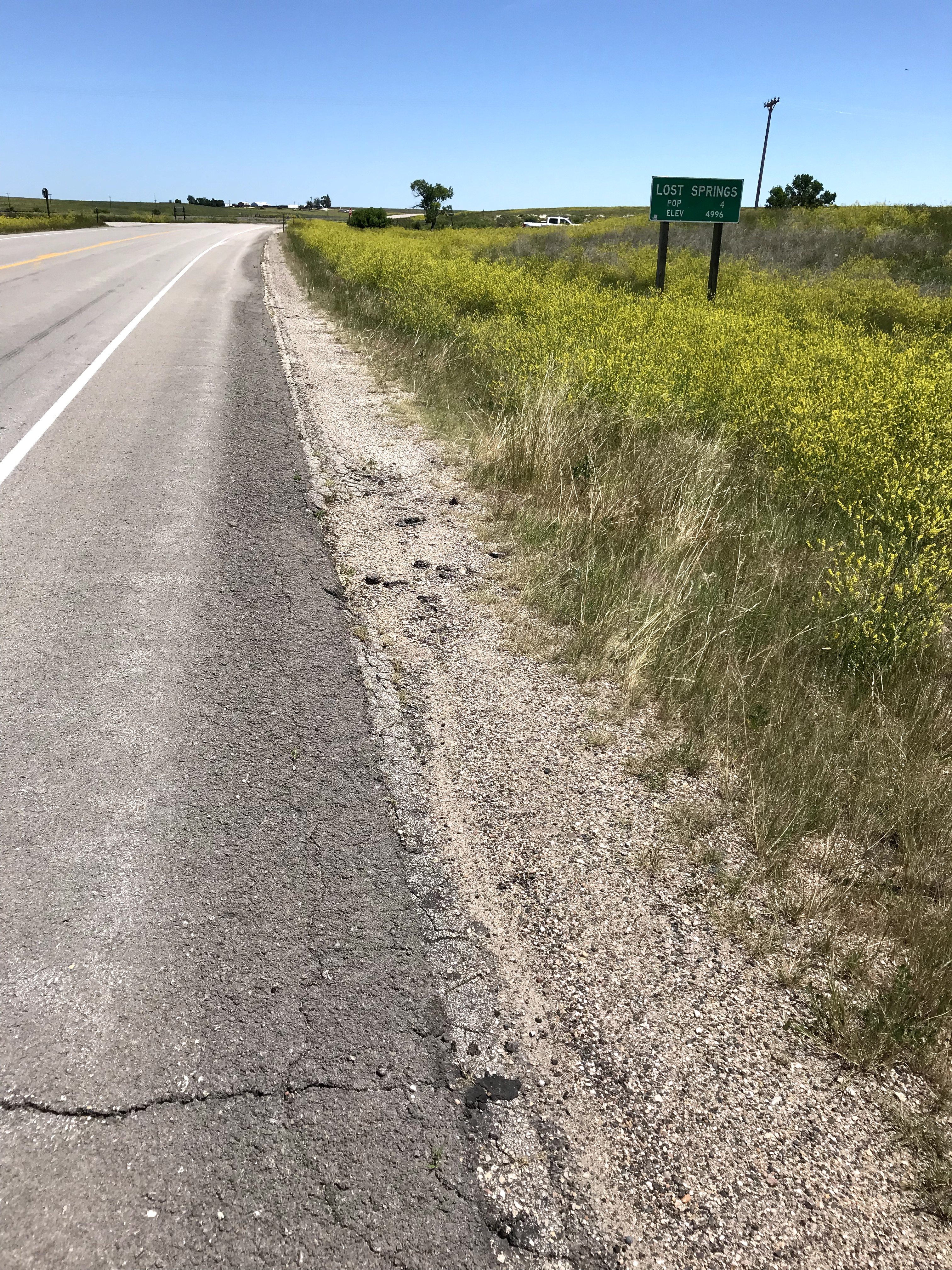A highlight of the day was passing through the town of Lost Springs, population 4. I counted two trucks parked at the town Bar – so it seems likely that at least half the town was in the bar when I rode through.
