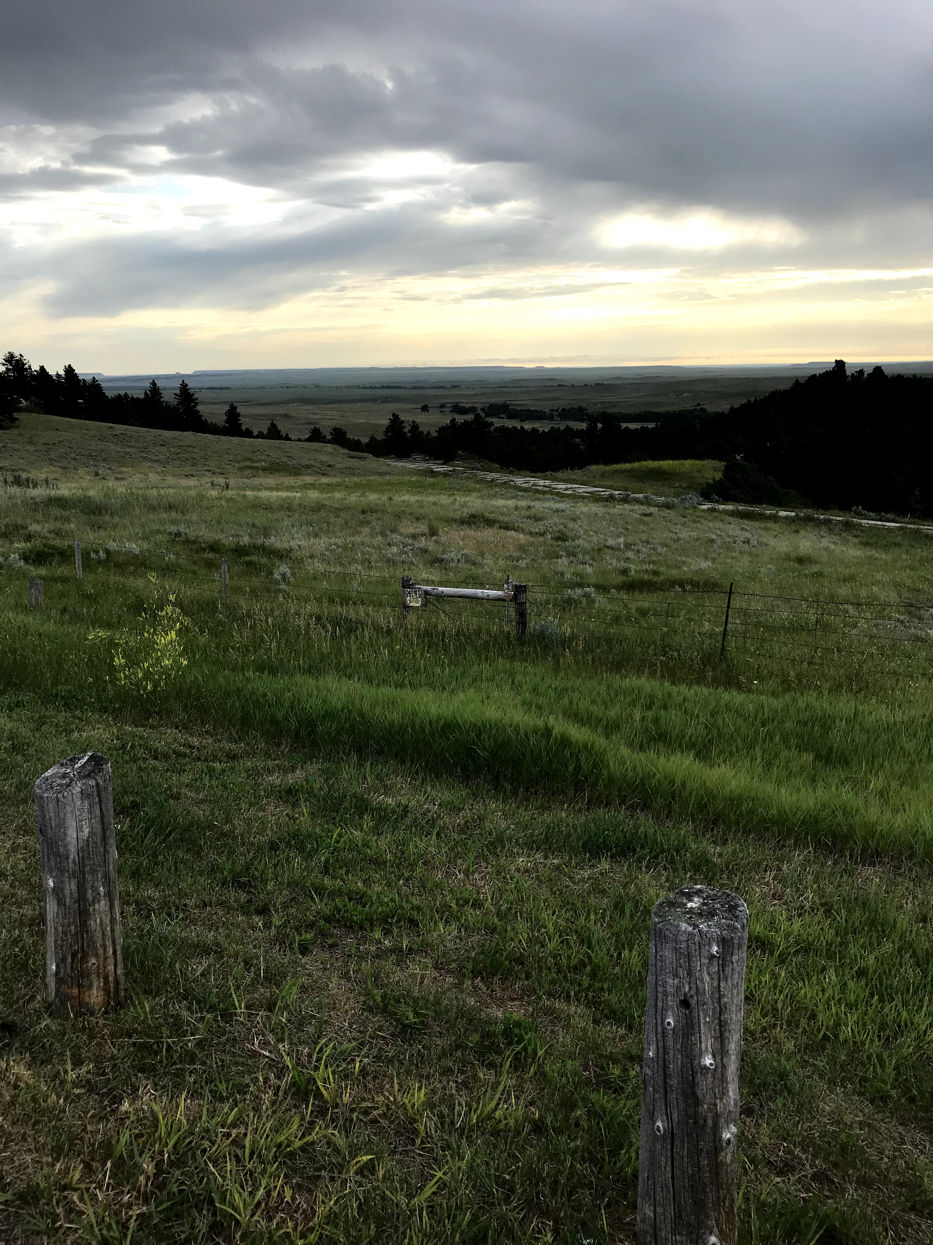 Approaching a bluff, I witnessed something I hadn’t seen in several days… a pine tree. And then a few more. Trees! Evidently, pine trees are able to survive in a few sheltered places on the Wyoming prairie. Enthralled, I pulled into an overlook to snap a picture and take in the view.