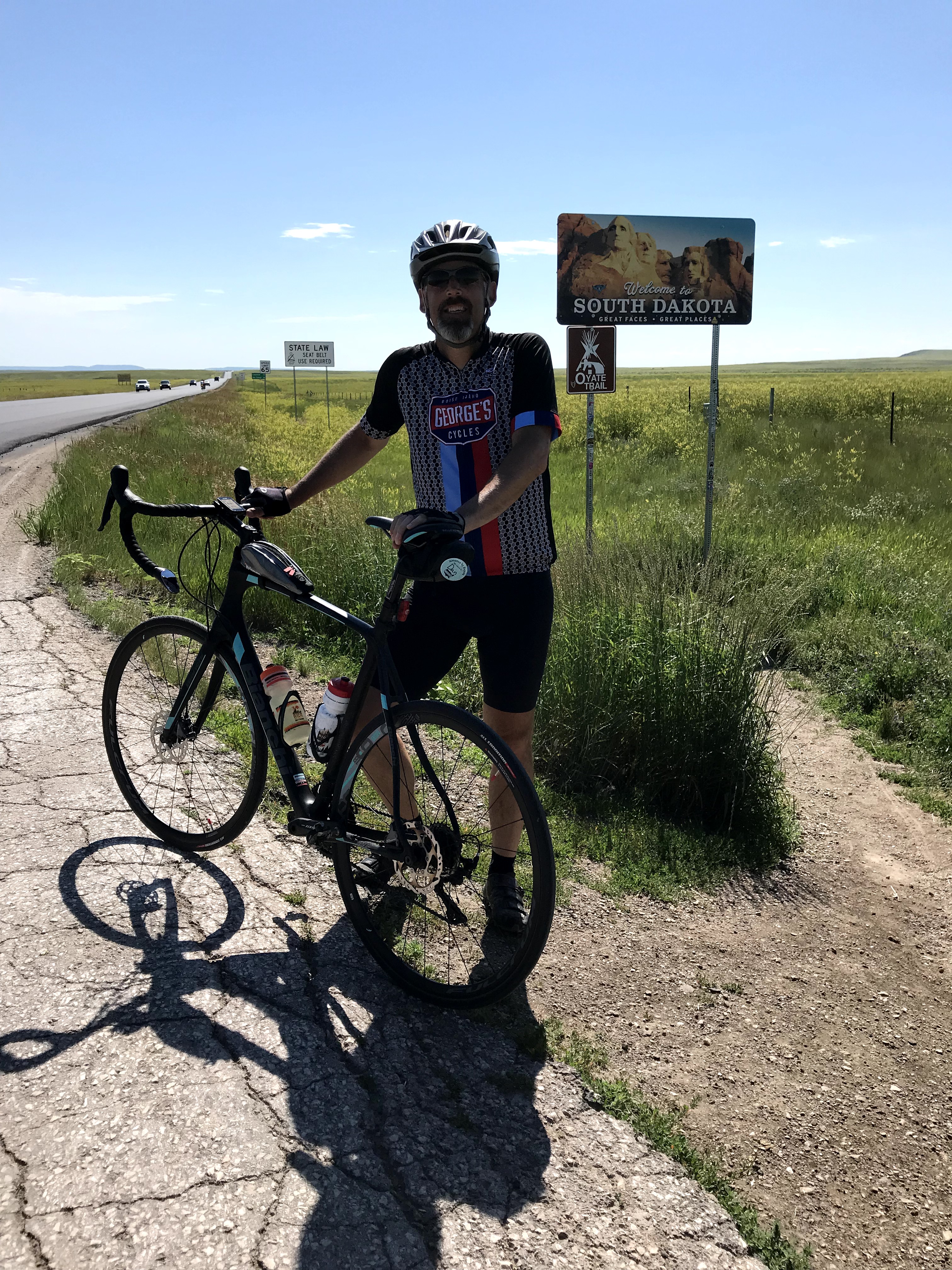 Crossed into my 4th state today on this coast-to-coast bicycle journey: South Dakota. Great Faces, Great Places. Since we travel from west to east, our obligatory state line pictures are mostly backlit. So, Dark Faces, Bright Places might be a better catch phrase.