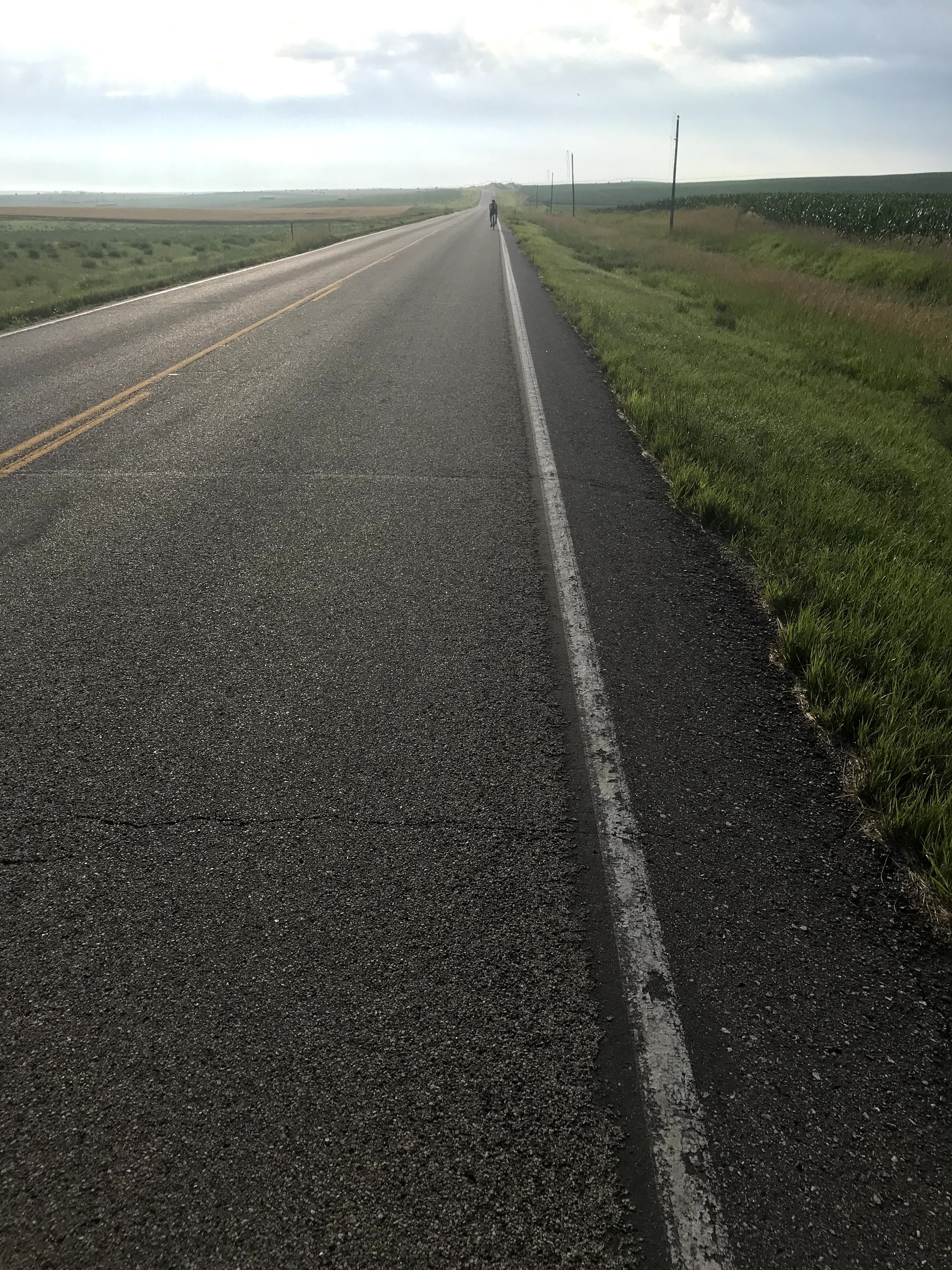 Most of the day was spent on an old, little used highway that runs between train tracks and interstate. Quiet and peaceful. Green and wet from heavy spring snow and rain. Some singing birds and an occasional rumble of farm machinery.