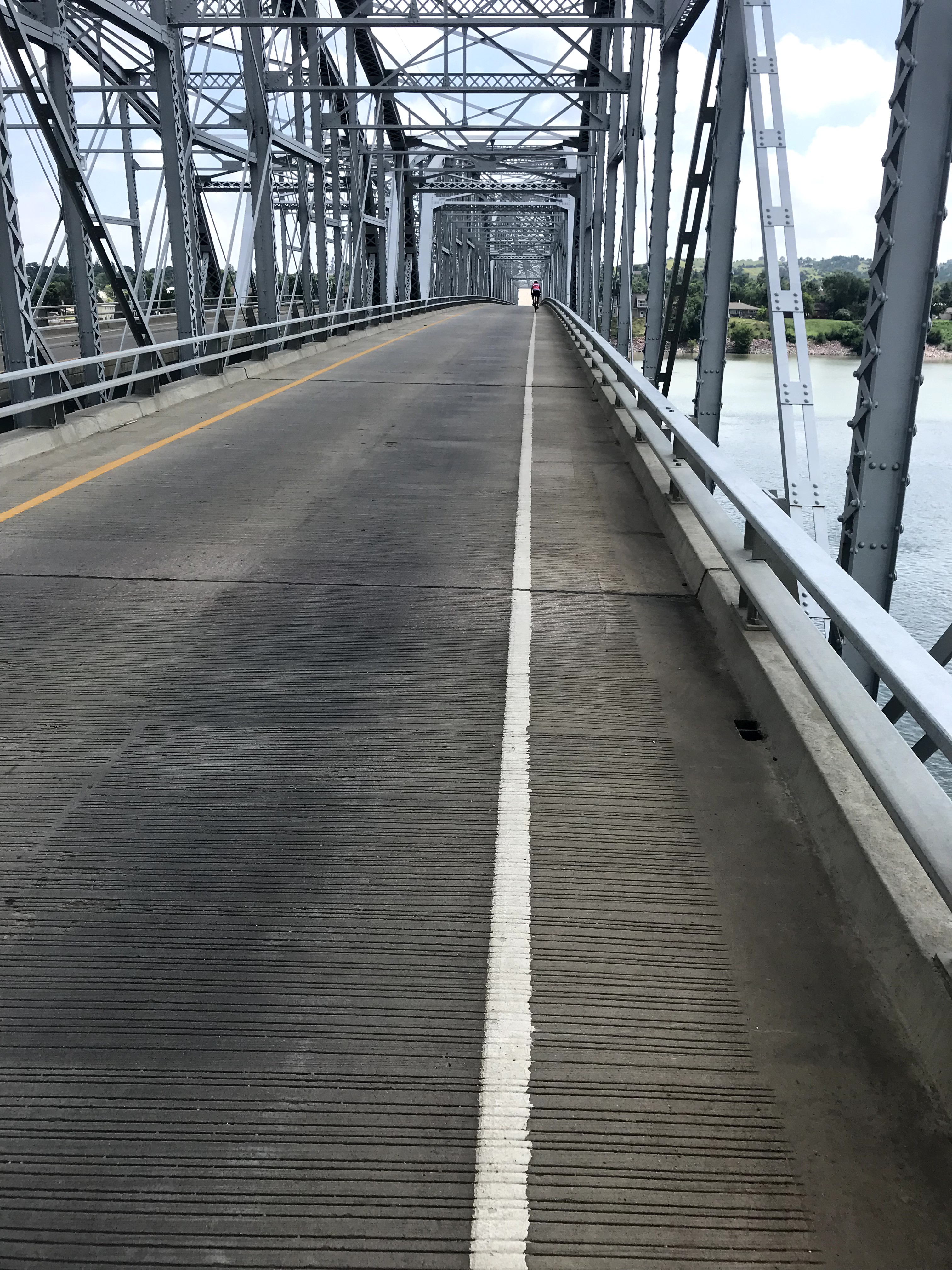 Eventually, the turning wheels came upon a wide Missouri river and our destination town of Chamberlain across an old steel bridge.