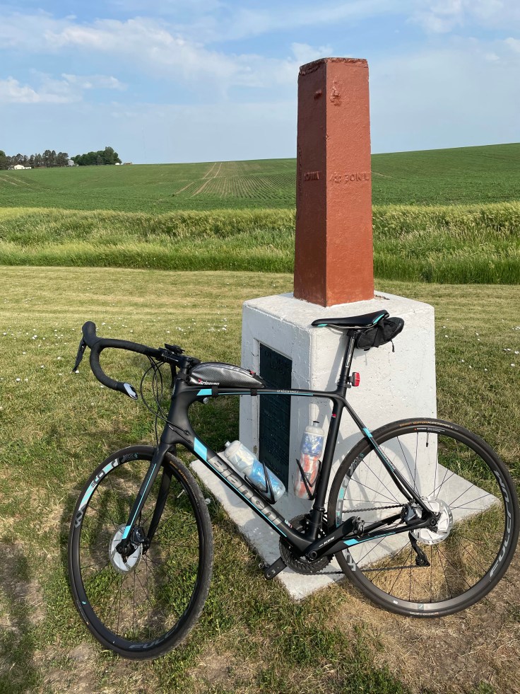 66 degrees at the start of todays ride, 91 at the finish. 74 miles, mostly into a stiff 10-15 mph wind. An inspiring start through the Sioux Falls Greenway which was teeming with joggers, walkers, strollers, young men’s and women’s running teams, and at least one crazy cyclist peddling across the country. Cruising out of the city, I wound down to a farm road that runs right along a borderline – Iowa on my right, South Dakota on my left. Then, about 20 miles out of town, I came upon a geographical point of interest: