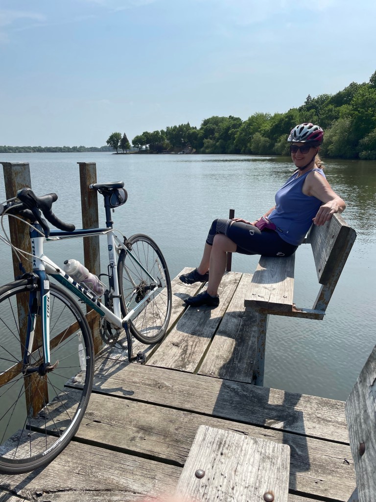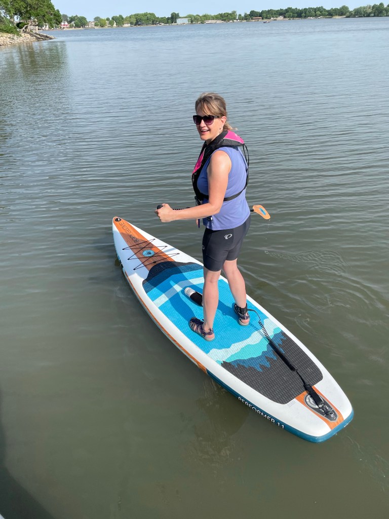 After the excitement in Luverne, it was a steady headwind roll into our destination town of Worthington. Jackie smartly skipped the town-to-town riding (providing awesome support!) and instead took a 6 mile stroll around Worthington’s Lake Okabena. Lined with parks, paths, and some nice lakefront homes, Okabena is a wonderful city lake. And not content with merely riding AROUND the lake, Jax pumped up the paddleboard and rode ON the lake. Way to go, Babe!