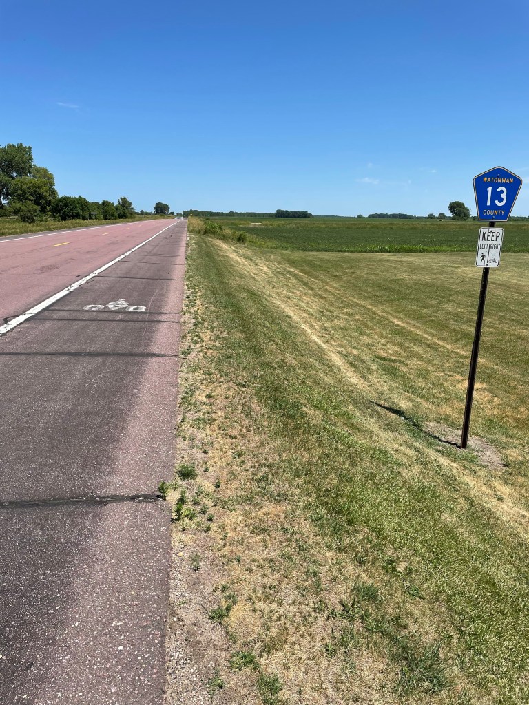 An unexpected ‘rural road bike lane’ offered a wonderfully wide shoulder and designated bikeway between the towns of St. James and Madelia, courtesy of the WATonwan COunty Trail System. A thank you and shout out to WATCOTS.