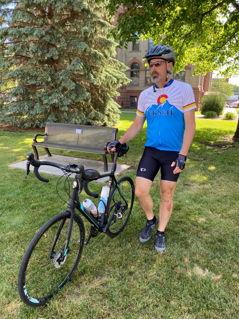 The big man on three wheels was absolutely correct – it was a ways to Mankato. 110 miles total. 66 degrees to start, 91 at the finish. Light winds (thankfully) throughout, except when I found myself in the middle of a huge wind farm – I guess they know to put those big turbines in wind-prone areas!