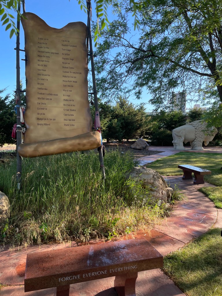 Today’s ride began with a stop at Reconciliation Park in Mankato, a sacred parcel of land near the site where 38 Dakota Warriors were executed during the U.S.-Dakota War of 1862 – the largest mass execution in U.S. History. The poignant park lists the names of those lost, features a spiritual buffalo statue, and tries to both teach and amend the clash of cultures through a powerful phrase: Forgive Everyone Everything