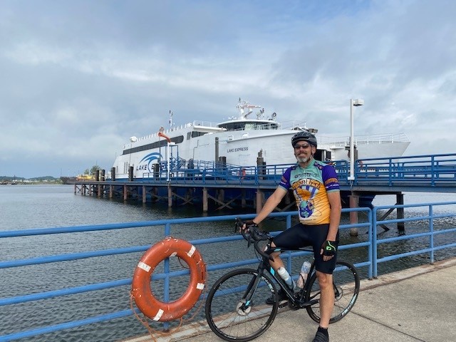 And so it begins… again. A 9:30 arrival in Muskegon Michigan on-board the Lake Express, after a 6am departure from Milwaukee. A strong south wind whipped up 5 foot swells atop Lake Michigan, swaying our morning ferry boat ride back and forth. Land-lubber passengers appreciated free Dramamine, while the vehicles one deck below appreciated a sturdy parking brake. Two wheels on solid ground felt amazingly stable.