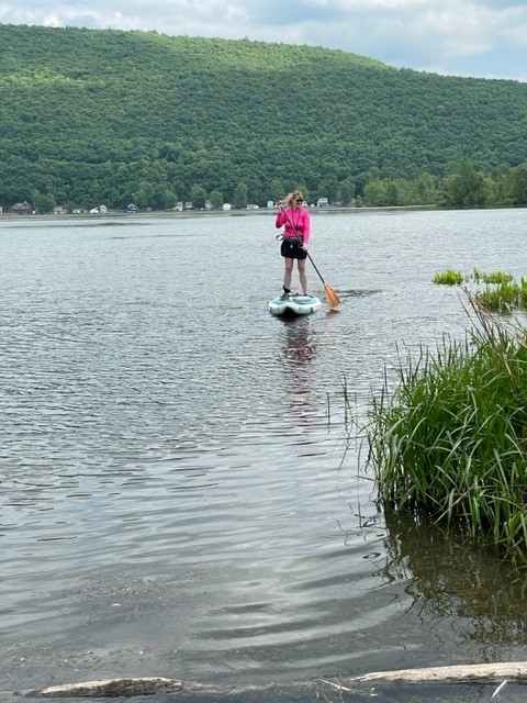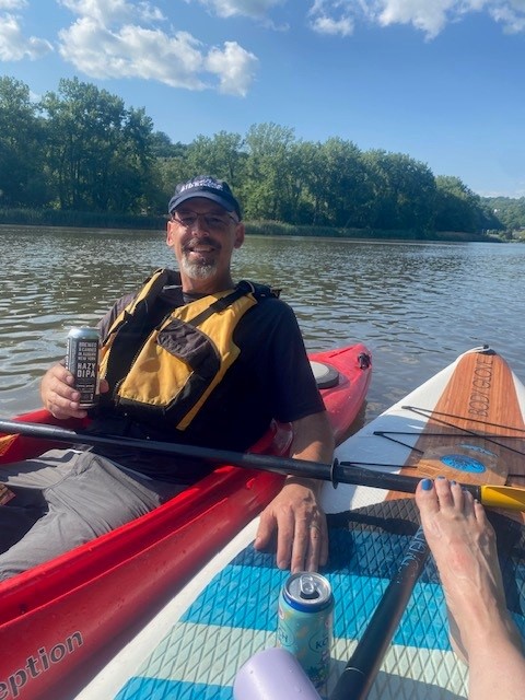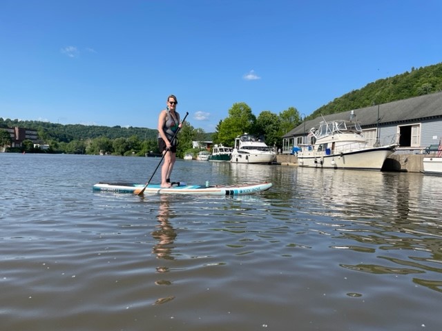 Celebrating the sunshine and a successful 80 mile ride, the paddleboard was launched and a kayak rented from the Little Falls marina. Here’s to another great day on our coast to coast adventure: