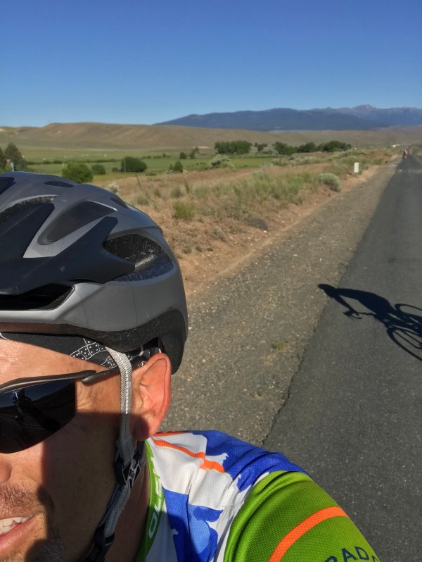 Sometimes the best views are behind us. Sort of a metaphoric statement, but perhaps apropos as we cycle onward. Here’s an attempted over-the-shoulder selfie, with Oregon’s Elkhorn mountain range in the back vista (along with the morning shadow of a fellow rider). A somewhat risky maneuver while on the bike, but traffic is virtually non-existent on this pleasant route out of Baker. ‘Old Highway 30’ has been rendered nearly obsolete by nearby Interstate 84 – but it openly welcomed us two-wheel travelers.